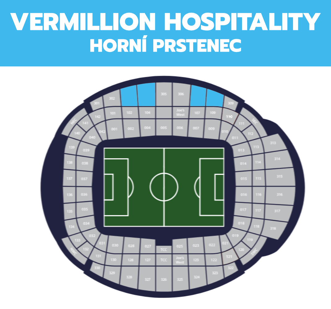 • VIP polstrované sezení na podélné tribuně nebo v rohovém sektoru (sektory 109/110/121 či obdobné)